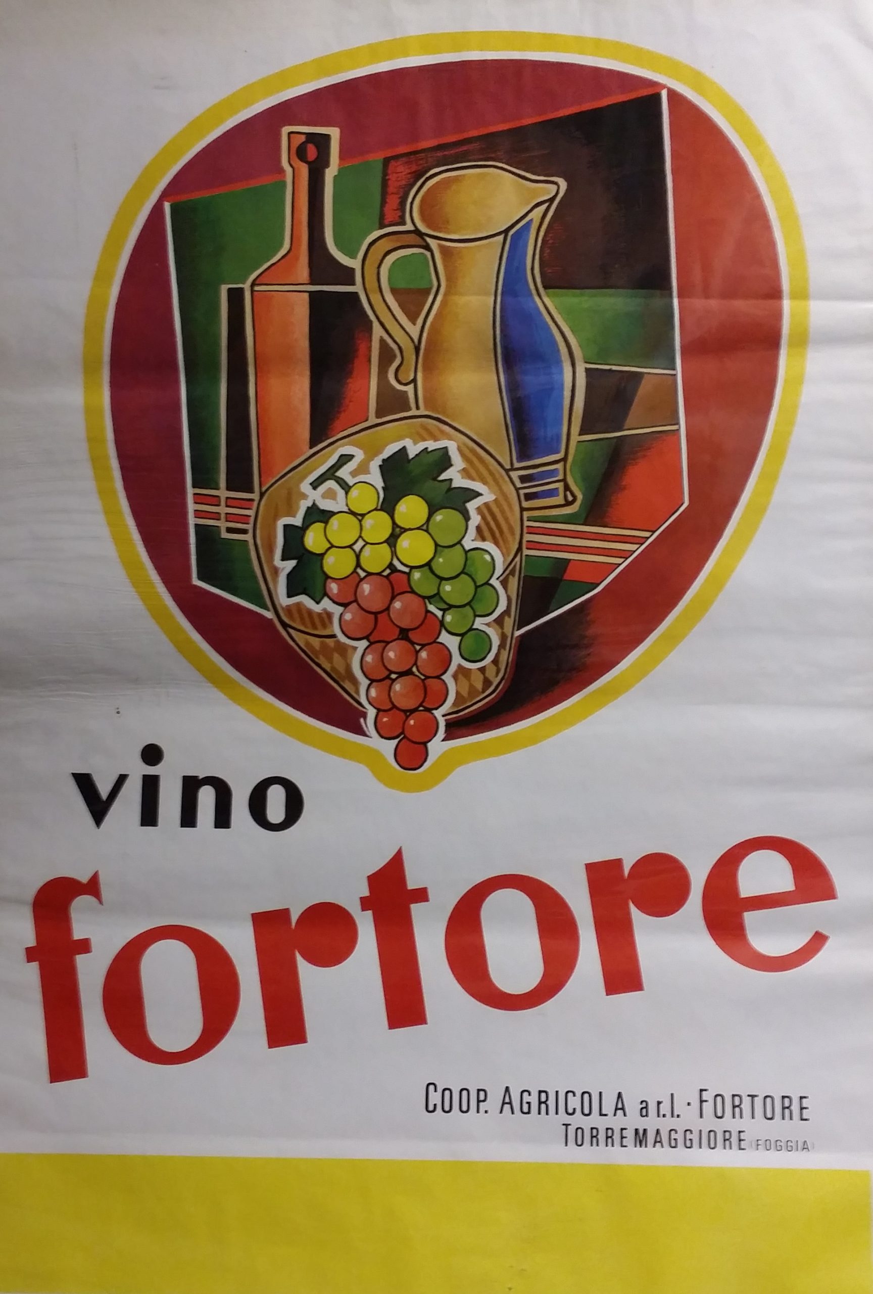 We don’t know the author of this manifesto, and it all makes you think of a minor draftsman. The composition is perhaps complex, but the idea of still life enlivened by the different stages of ripening of the grapes is brilliant and conveys very well the idea of a natural and popular wine, as suggested by the name of the company. This poster was printed in the 70s in Tuscany by the printing press “The Graphic Art” of Livorno and is presented in excellent condition.